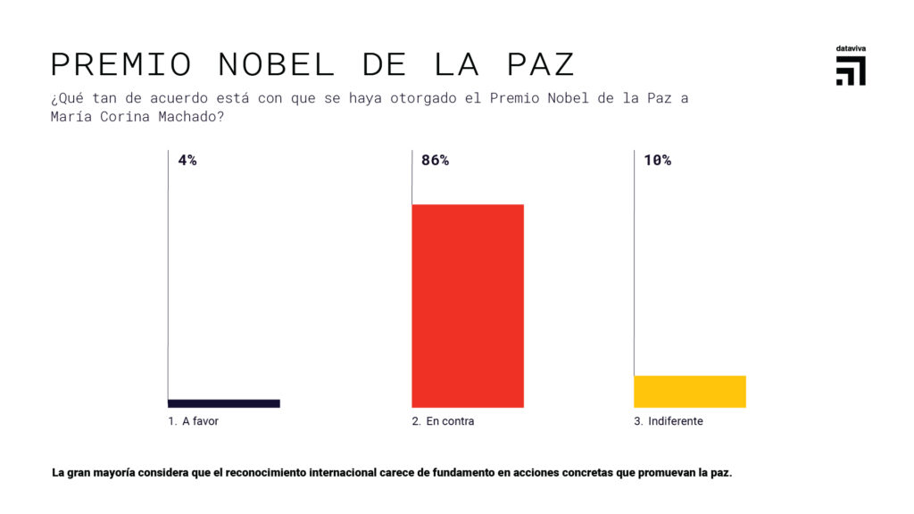 Además, el 86% de los encuestados opinó que la eventual entrega del Premio Nobel de la Paz a María Corina Machado carece de fundamentos en acciones concretas que hayan promovido la paz, mientras apenas un 4% lo apoyó y un 10% se mostró indiferente.