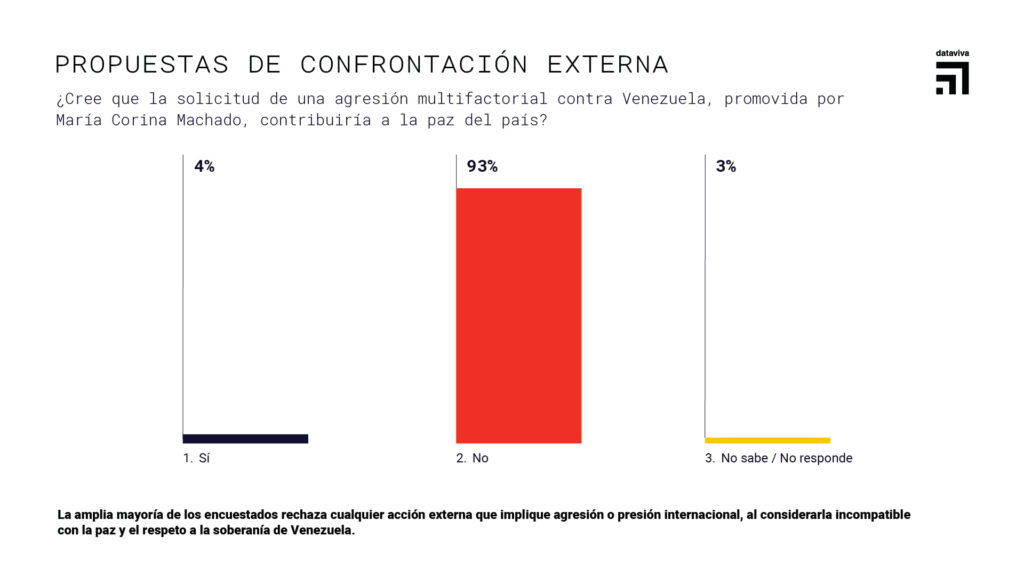 El 84% de los consultados consideró que María Corina Machado no ha realizado ningún esfuerzo por alcanzar la paz en el país, mientras solo un 6% opinó lo contrario y un 10% no se pronunció. Cuando se les preguntó sobre la iniciativa de la dirigente de promover una agresión multifactorial contra Venezuela, el 93% rechazó este tipo de acciones, considerándolas incompatibles con la paz y el respeto a la soberanía nacional. Solo un 4% apoyó la agresión y un 3% no respondió.