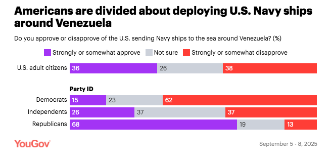 Una encuesta de YouGov, de comienzos de septiembre, reveló que el 62% de los estadounidenses se oponen a una invasión estadounidense de Venezuela y solo un 16% la apoya.