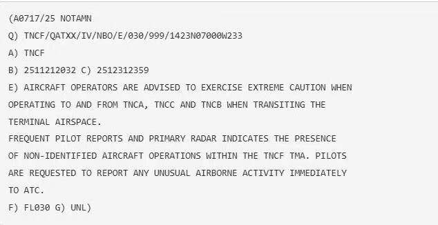 La autoridad aeronáutica de Curazao emitió un aviso urgente (NOTAM) para advertir a los pilotos sobre la presencia de aeronaves no identificadas, incluidos drones, que están siendo detectados en su espacio aéreo y en las rutas hacia Aruba y Bonaire.