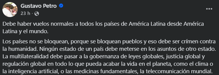 En una publicación de Facebook, el presidente de Colombia, Gustavo Petro aseguró que deben haber «vuelos normales a todos los países de América Latina desde América Latina y el mundo«.