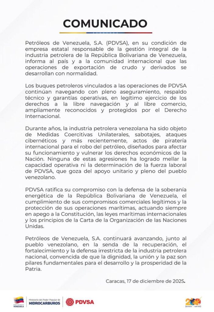 Así lo dijo la Vicepresidenta Ejecutiva de Venezuela, Delcy Ramírez quien agregó, «Venezuela hará respetar sus derechos en materia de libre comercio y libre navegabilidad, conforme al Derecho Internacional, al desarrollo y al ejercicio de su soberanía».