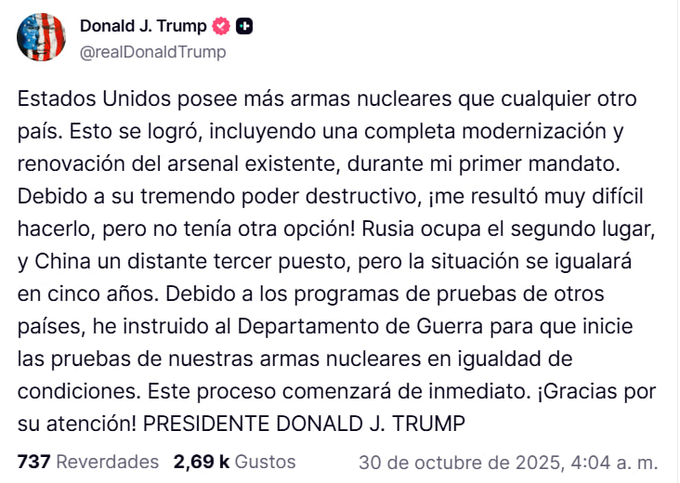 “Debido a los programas de pruebas de otros países, he dado instrucciones al Departamento de Guerra para que comience a probar nuestras armas nucleares en igualdad de condiciones. Ese proceso comenzará de inmediato”, escribió el mandatario.