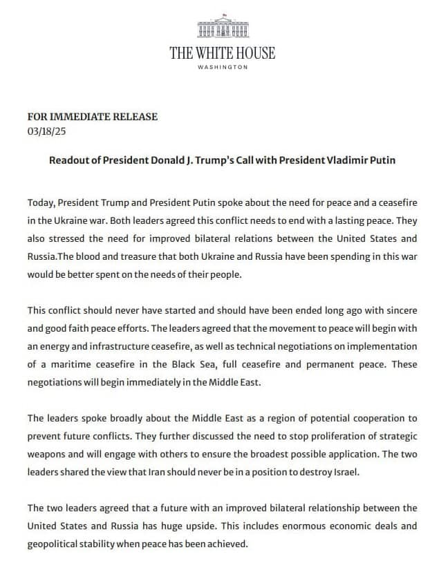 El alto el fuego por 30 días para objetivos energéticos y sus infraestructuras y comenzar de inmediato las negociaciones técnicas sobre el alto el fuego marítimo en el Mar Negro.