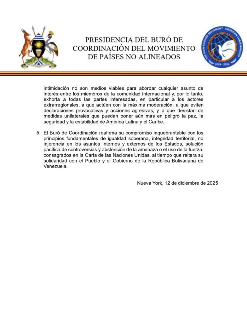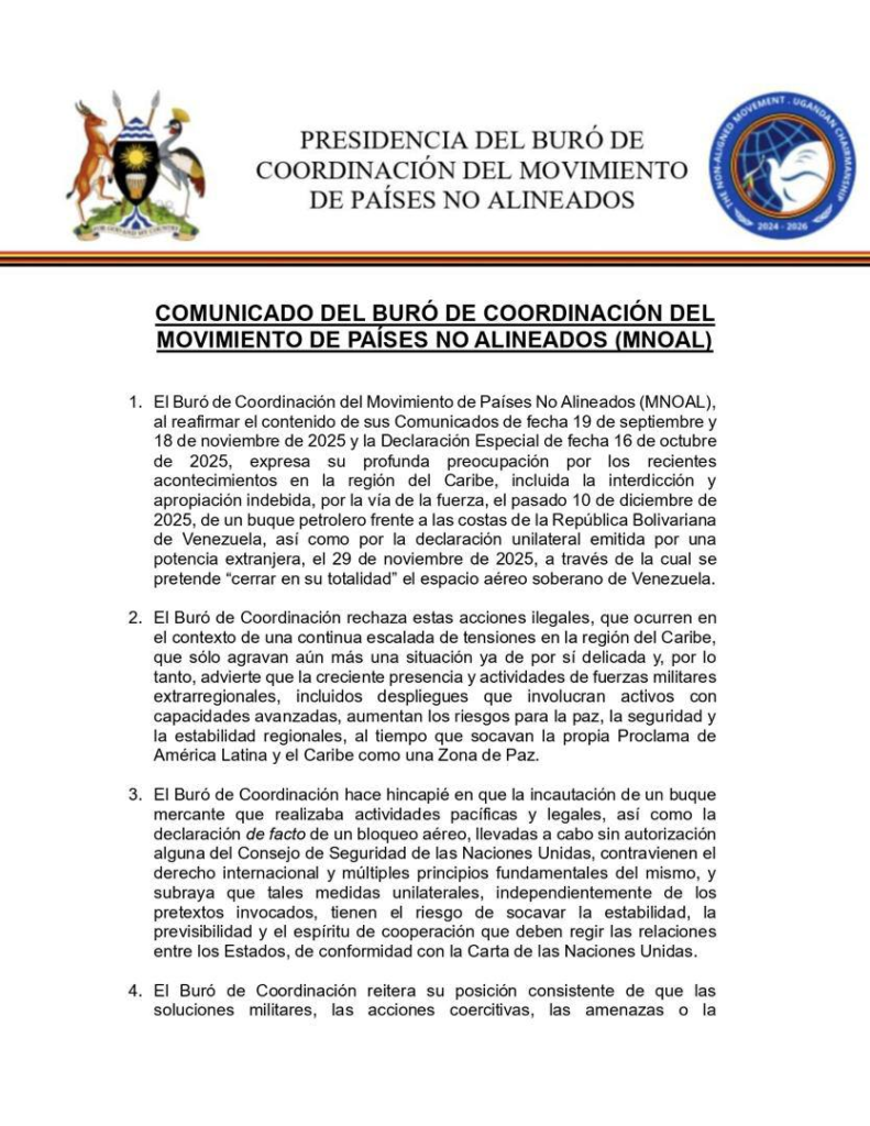 En un comunicado emitido desde Nueva York, el Buró de Coordinación del MNOAL condenó la interdicción y apropiación forzada de un buque petrolero venezolano, ocurrida el pasado 10 de diciembre frente a las costas del país, así como la declaración unilateral de una potencia extranjera que pretende “cerrar en su totalidad” el espacio aéreo soberano de Venezuela.