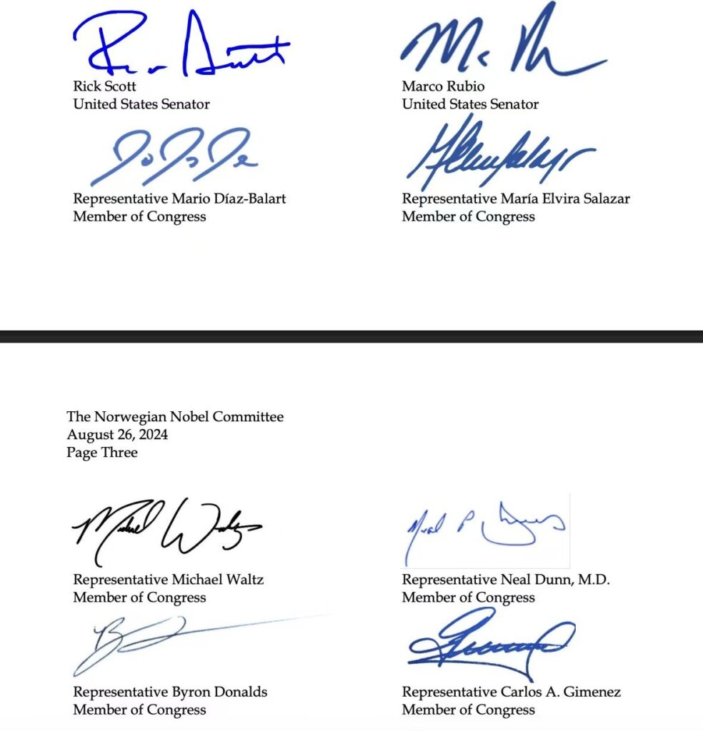 Así puede leerse en la carta de postulación que firmaron en agosto del año pasado Rubio, Waltz, Rick Scott, Mario Díaz Balart, María Elvira Salazar y los representantes del Congreso Byron Donalds y Carlos A. Giménez.