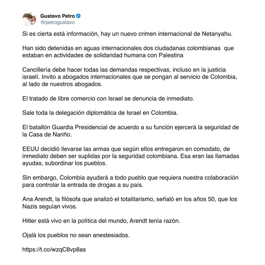 El presidente de Colombia, Gustavo Petro, calificó este miércoles como un «nuevo crimen internacional» la interceptación llevada a cabo por fuerzas israelíes contra la Flotilla Global Sumud, destinada a entregar ayuda humanitaria en la Franja de Gaza. Durante la acción, resultaron detenidas las ciudadanas colombianas Manuela Bedoya y Luna Barreto, quienes participaban en actividades de solidaridad con Palestina.