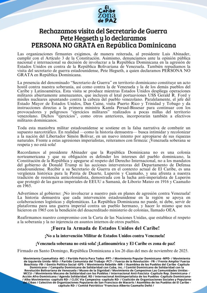 En un comunicado conjunto firmado por más de 30 agrupaciones, se denuncia que la presencia de Hegseth constituye un acto hostil contra la soberanía dominicana y la de Venezuela, en el marco de la creciente militarización del Caribe por parte de Estados Unidos.