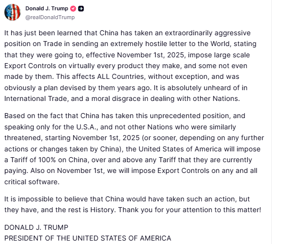 Donald Trump, anunció que su gobierno impondrá un arancel del 100 % a todas las importaciones procedentes de China a partir del 1 de noviembre, una medida que agravó la ya tensa relación comercial entre ambas potencias.