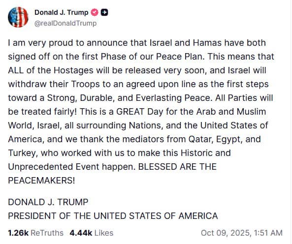 El presidente de Estados Unidos, Donald Trump, informó a través de su red social Truth Social que el régimen genocida de Israel y Hamás firmaron la primera fase de un plan de paz diseñado por su administración.