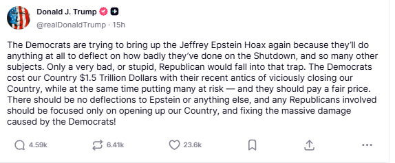 Por su parte, el mandatario recurrió a su red Truth Social para responder a las acusaciones, escribiendo: “Los demócratas están tratando de sacar a relucir nuevamente el bulo de Jeffrey Epstein porque harán cualquier cosa para desviar la atención de lo mal que lo han hecho respecto al cierre del Gobierno y tantos otros temas”.