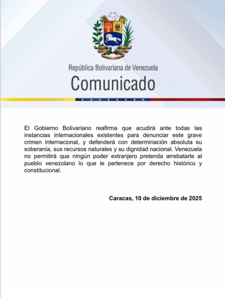 La República Bolivariana de Venezuela denunció y repudió enérgicamente lo que constituye un robo descarado y un acto de piratería internacional, anunciado de manera pública por el presidente de los Estados Unidos, quien confesó el asalto de un buque petrolero en el mar Caribe.