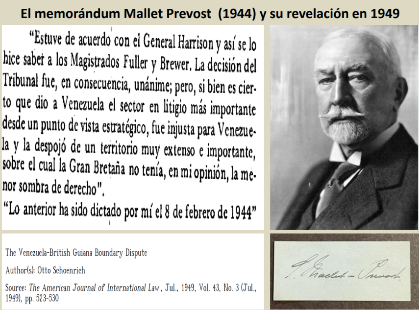 Uno de los hechos que reforzó la tesis venezolana fue la revelación en 1945 de uno de los Abogados que participó en el laudo de París, Severo Mallet Prevost, quien confesó la ilegalidad del laudo por haber sido un arreglo entre el imperio británico y EE.UU. en prejuicio de Venezuela e informó del injusto despojo de ese territorio.